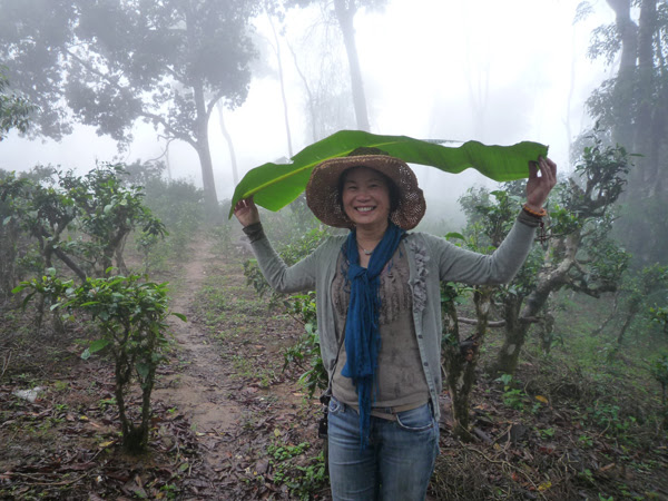 Yang Su in Xishuangbanna with ancient puer tea trees. At the end of the video she tastes a puer tea leaf from an 800-year-old tree and found it to be extremely bitter (she searches for the words in English but she can't find the words:) Later she finds that a sweet taste from the leaf lasts for hours in her mouth.