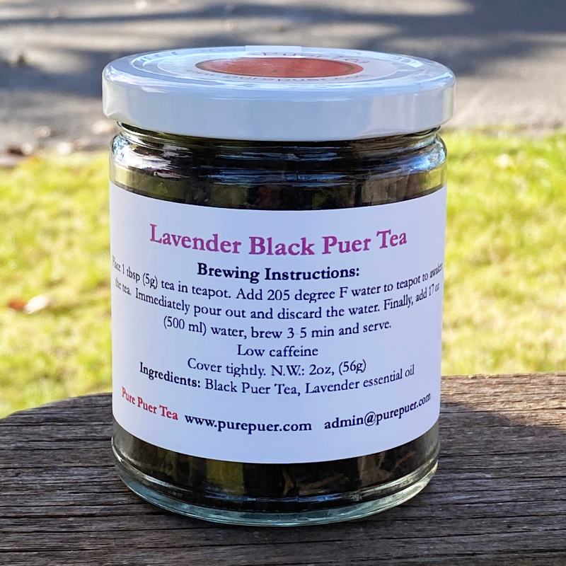 Our own Lavender Black Puer Tea with food grade lavender essential oil. This tea is low in caffeine, easy on the stomach, low in acidity, and has all the benefits of puer tea. Lavender is good for relaxation and stress reduction and is anti-inflammatory. Our lavender puer tea has a gentle, soothing flavor.