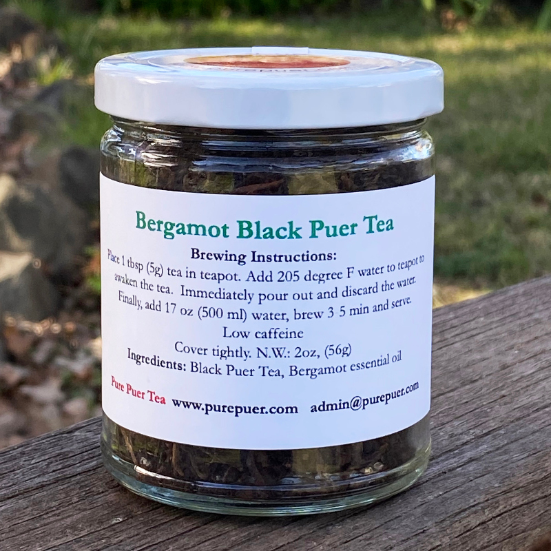 Our own Black Puer Tea with food grade bergamot essential oil. This tea is low in caffeine, easy on the stomach, low in acidity, and has all the benefits of puer tea. Bergamot is good for lowering cholesterol, aiding digestion, relaxation and stress reduction, anti-inflammatory and helps fight viruses and colds. Bergamot comes from the skin of a citrus fruit from Italy. Historically, it has been added to traditional black tea to make Earl Grey tea. Our bergamot puer tea has a gentle, soothing flavor.